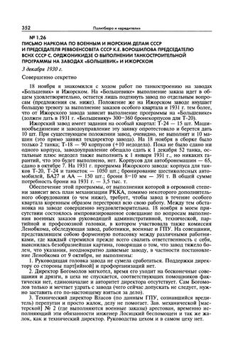 Письмо наркома по военным и морским делам СССР и председателя Реввоенсовета СССР К.Е. Ворошилова председателю ВСНХ СССР С. Орджоникидзе о выполнении танкостроительной программы на заводах «Большевик» и Ижорском. 3 декабря 1930 г. // РГВА. Ф. 31811. Oп. 1. Д. 245. Л. 241-245. Заверенная копия. Опубликовано: Становление оборонно-промышленного комплекса СССР (1927—1937). Ч. 1 (1927-1932). М., 2008. С. 508-510.