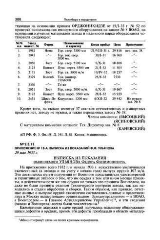 Докладная записка заместителя председателя ОГПУ Г.Г. Ягоды и начальника ЭКУ ОГПУ Л.Г. Миронова И.В. Сталину о вредительской организации в орудийно-арсенальной промышленности. Приложения к докладной записке о деятельности К.-Р. вредительской и шпионской организации в орудийно-арсенальной промышленности. Приложение № 18-а. Выписка из показаний Ф.Ф. Ульянова. 29 мая 1933 г. // АП РФ. Ф. 3. Оп. 58. Д. 341. Л. 86—88. Копия. Машинопись.