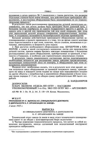 Докладная записка заместителя председателя ОГПУ Г.Г. Ягоды и начальника ЭКУ ОГПУ Л.Г. Миронова И.В. Сталину о вредительской организации в орудийно-арсенальной промышленности. Приложения к докладной записке о деятельности К.-Р. вредительской и шпионской организации в орудийно-арсенальной промышленности. Приложение № 41. Выписка из «Официального документа о деятельности К.-Р. организации на заводе». 2 июля 1933 г. // АП РФ. Ф. 3. Оп. 58. Д. 341. Л. 160-161. Копия. Машинопись.