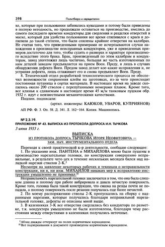 Докладная записка заместителя председателя ОГПУ Г.Г. Ягоды и начальника ЭКУ ОГПУ Л.Г. Миронова И.В. Сталину о вредительской организации в орудийно-арсенальной промышленности. Приложения к докладной записке о деятельности К.-Р. вредительской и шпионской организации в орудийно-арсенальной промышленности. Приложение № 43. Выписка из протокола допроса И.Н. Тычкова. 3 июня 1933 г. // АП РФ. Ф. 3. Оп. 58. Д. 341. Л. 165—167. Копия. Машинопись.