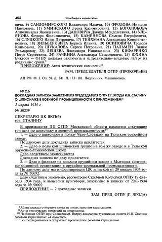 Докладная записка заместителя председателя ОГПУ Г.Г. Ягоды И.В. Сталину о шпионаже в военной промышленности с приложением. 2 марта 1934 г. // АП РФ. Ф. 3. Оп. 58. Д. 341. Л. 182—188. Подлинник. Машинопись.
