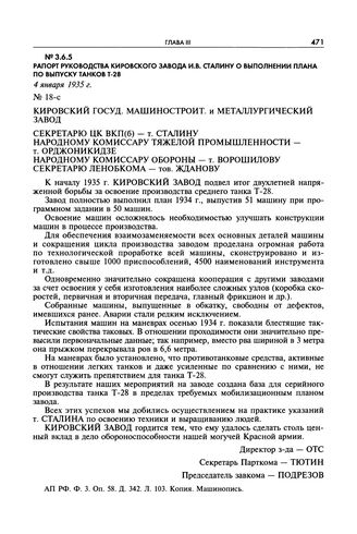 Приложения о расследовании причин поломок танка Т-28. Рапорт руководства Кировского завода И.В. Сталину о выполнении плана по выпуску танков Т-28. 4 января 1935 г. // АП РФ. Ф. 3. Оп. 58. Д. 342. Л. 103. Копия. Машинопись.