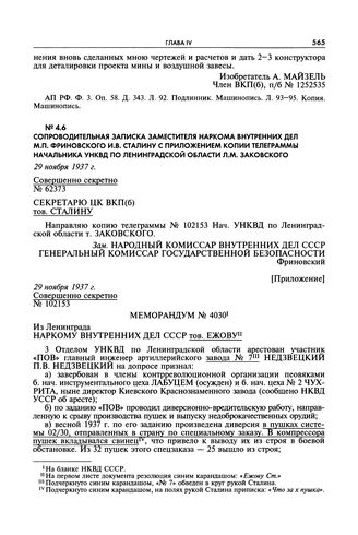 Сопроводительная записка заместителя наркома внутренних дел М.П. Фриновского И.В. Сталину с приложением копии телеграммы начальника УНКВД по Ленинградской области Л.М. Заковского. 29 ноября 1937 г. // АП РФ. Ф. 3. Оп. 58. Д. 343. Л. 96—98. Подлинник. Машинопись.