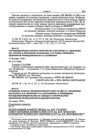 Сопроводительная записка секретаря МК и МГК ВКП(б) А.С. Щербакова И.В. Сталину в отношении начальника 1-го Главка наркомата оборонной промышленности С.И. Беляйкина. 17 декабря 1938 г. // АП РФ. Ф. 3. Оп. 58. Д. 343. Л. 118. Подлинник. Машинопись.