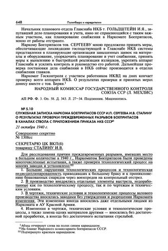Служебная записка наркома боеприпасов СССР И.П. Сергеева И.В. Сталину о результатах проверки преждевременных разрывов боеприпасов в каналах ствола с приложением приказа НКБ СССР. 21 октября 1940 г.