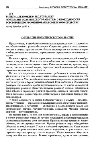 Записка А.Н. Яковлева М.С. Горбачеву «Императив политического развития» о необходимости всестороннего реформирования советского общества. Конец декабря 1985 г. // ГА РФ. Ф. 10063. Oп. 1. Д. 380. Машинописная копия. Опубликовано частично: Яковлев А.Н. Горькая чаша. Ярославль. 1994. С. 205—212; Яковлев А.Н. Сумерки. М., 2003. С. 380-383.