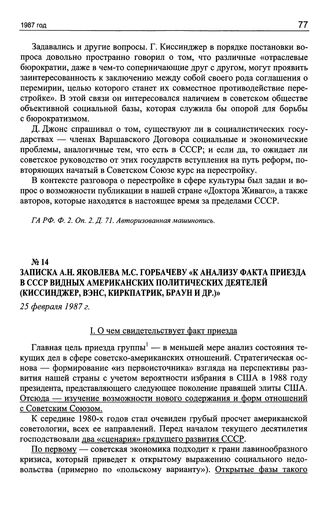 Записка А.Н. Яковлева М.С. Горбачеву «К анализу факта приезда в СССР видных американских политических деятелей (Киссинджер, Вэнс, Киркпатрик, Браун и др.)». 25 февраля 1987 г.