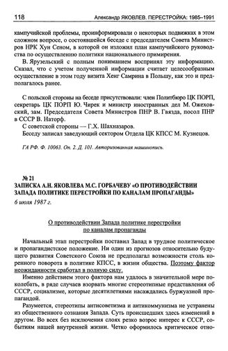 Записка А.Н. Яковлева М.С. Горбачеву «О противодействии Запада политике перестройки по каналам пропаганды». 6 июля 1987 г. // ГА РФ. Ф. 10063. Oп. 1. Д. 387. Машинописная копия.
