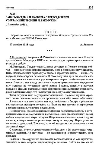 Запись беседы А.Н. Яковлева с председателем Совета министров ПНР М. Раковским. 21 октября 1988 г. // ГА РФ. Ф. 10063. Oп. 2. Д. 129. Авторизованная машинопись.