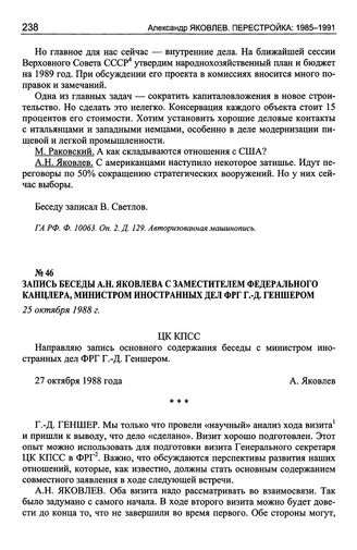 Запись беседы А.Н. Яковлева с заместителем федерального канцлера, министром иностранных дел ФРГ Г.-Д. Геншером. 25 октября 1988 г. // ГА РФ. Ф. 10063. Oп. 1. Д. 253. Авторизованная машинопись.