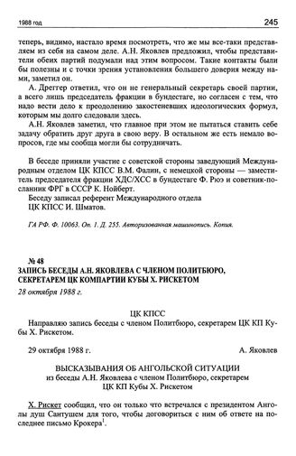 Запись беседы А.Н. Яковлева с членом Политбюро, секретарем ЦК Компартии Кубы X. Рискетом. 28 октября 1988 г. // ГА РФ. Ф. 10063. Oп. 2. Д. 130. Авторизованная машинопись.