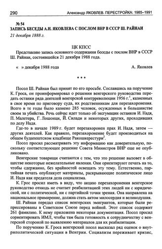 Запись беседы А.Н. Яковлева с послом ВНР в СССР Ш. Райнаи. 21 декабря 1988 г. // ГА РФ. Ф. 10063. Oп. 2. Д. 147. Авторизованная машинопись.