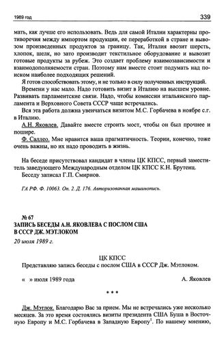 Запись беседы А.Н. Яковлева с послом США в СССР Дж. Мэтлоком. 20 июля 1989 г. // ГА РФ. Ф. 10063. Oп. 1. Д. 264. Авторизованная машинопись. Ксерокопия.
