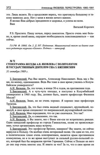 Стенограмма беседы А.Н. Яковлева с политологом и государственным деятелем США 3. Бжезинским. 31 октября 1989 г. // ГА РФ. Ф. 10063. Oп. 1. Д. 266. Машинописная копия.
