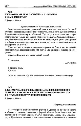 Письмо писателя В.Г. Распутина А.Н. Яковлеву с благодарностью. Иркутск, 3 февраля 1990 г. // ГА РФ. Ф. 10063. Oп. 2. Д. 508. Машинопись. Подлинник. Подпись — автограф.