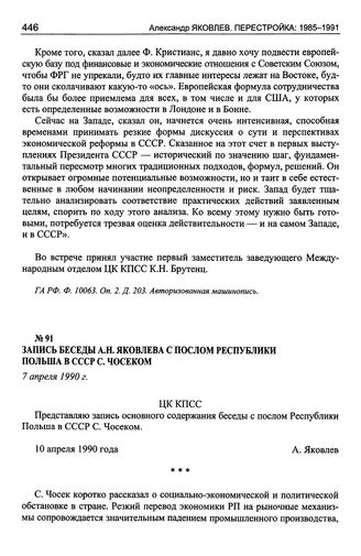 Запись беседы А.Н. Яковлева с послом Республики Польша в СССР С. Чосеком. 7 апреля 1990 г. // ГА РФ. Ф. 10063. Oп. 2. Д. 204. Авторизованная машинопись.