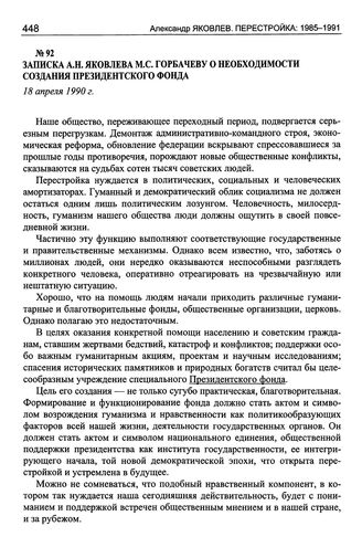 Записка А.Н. Яковлева М.С. Горбачеву о необходимости создания Президентского фонда. 18 апреля 1990 г. // ГА РФ. Ф. 10063. Oп. 1. Д. 395. Авторизованная машинопись. Ксерокопия.
