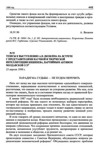 Тезисы к выступлению А.Н. Яковлева на встрече с представителями научной и творческой интеллигенции Кишинева, партийным активом Молдавской ССР. 23 апреля 1990 г. // ГА РФ. Ф. 10063. Oп. 2.Д. 304. Машинописная копия.