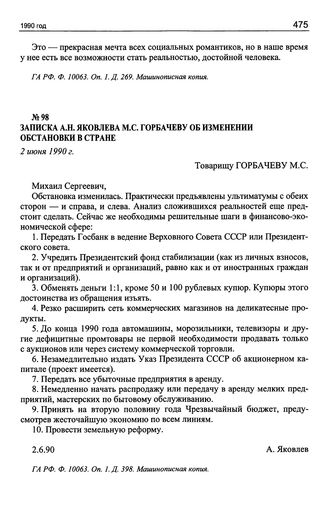 Записка А.Н. Яковлева М.С. Горбачеву об изменении обстановки в стране. 2 июня 1990 г.