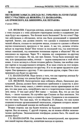 Обсуждение замысла доклада М.С. Горбачева на XXVIII съезде КПСС с участием А.Н. Яковлева, Г.Х. Шахназарова, А.Н. Ермонского, Н.Б. Биккенина, Н.Я. Петракова. 4 июня 1990 г. // Личный архив. Машинописная копия.