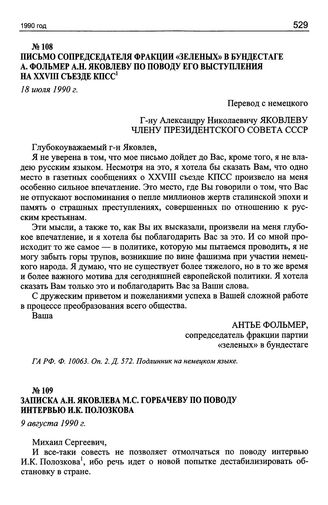 Письмо сопредседателя фракции «зеленых» в бундестаге А. Фольмер А.Н. Яковлеву по поводу его выступления на XXVIII съезде КПСС. 18 июля 1990 г. // ГА РФ. Ф. 10063. Oп. 2. Д. 572. Подлинник на немецком языке.