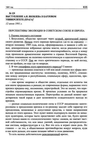 Выступление А.Н. Яковлева в Карловом университете (Прага). 12 июня 1991 г. // ГА РФ. Ф. 10063. Oп. 2. Д. 233. Машинопись с авторской правкой.