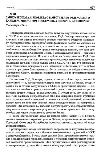 Запись беседы А.Н. Яковлева с заместителем федерального канцлера, министром иностранных дел ФРГ Г.-Д. Геншером. 9 сентября 1991 г. // ГА РФ. Ф. 10063. Oп. 1. Д. 276. Машинописная копия.