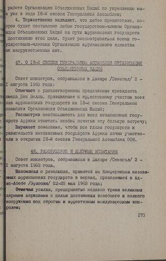 Первая очередная сессия Совета министров ОАЕ. Дакар, 2-11 августа 1963 года. О 18-й сессии Генеральной ассамблеи Организации объединенных наций