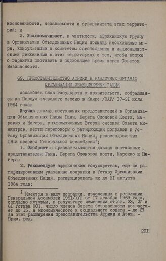 Первая сессия Ассамблеи глав государств и правительств ОАЕ. Каир, 17-21 июля 1964 года. Представительство Африки в различных органах Организации Объединенных Наций