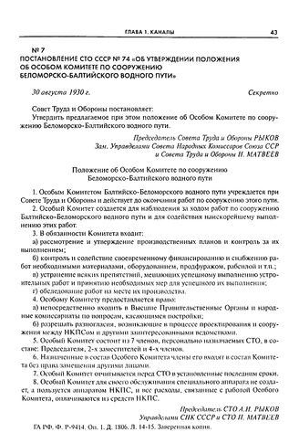 Постановление СТО СССР № 74 «Об утверждении Положения об Особом комитете по сооружению Беломорско-Балтийского водного пути». 30 августа 1930 г.