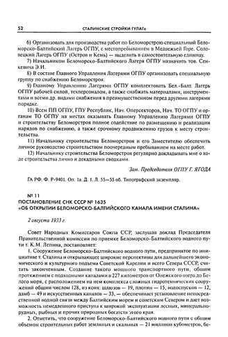 Постановление СНК СССР № 1635 «Об открытии Беломорско-Балтийского канала имени Сталина». 2 августа 1933 г.