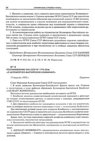 Постановление СНК СССР № 1774-384с «О Беломорско-Балтийском комбинате». 17 августа 1933 г.