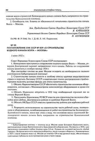 Постановление СНК СССР № 859 «О строительстве водного канала Волга - Москва». 1 июня 1932 г.