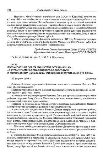Постановление Совета Министров СССР № 480-183с «О строительстве Волго-Донского водного пути и комплексном использовании водных ресурсов Нижнего Дона». 27 февраля 1948 г. // ГА РФ. Ф. Р-5446. Оп. 50а. Д. 3941. Л. 129-135. Подлинник.