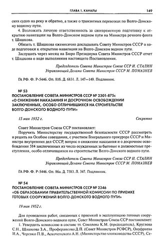 Постановление Совета Министров СССР № 2346 «Об образовании правительственной комиссии по приемке готовых сооружений Волго-Донского водного пути». 19 мая 1952 г.