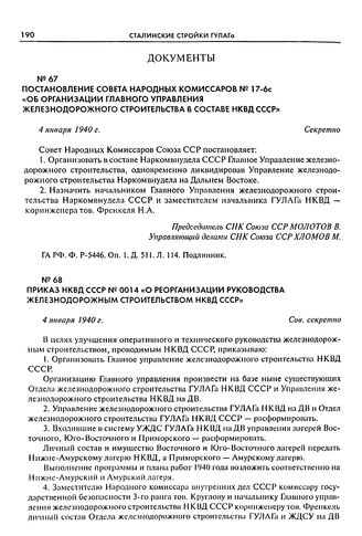 Главная Серия «Россия. XX век. Документы» Сталинские стройки ГУЛАГа. 1930-1953 Приказ НКВД СССР № 0014 «О реорганизации руководства железнодорожны...