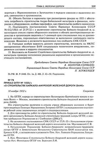 Приказ ОГПУ № 1020/с «О строительстве Байкало-Амурской железной дороги (БАМ)». 10 ноября 1932 г.