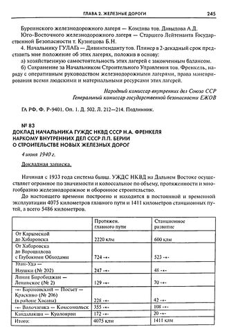 Доклад начальника ГУЖДС НКВД СССР Н.А. Френкеля наркому внутренних дел СССР Л.П. Берии о строительстве новых железных дорог. 4 июня 1940 г. // ГА РФ. Ф. Р-9407. Оп. 2. Д. 3. Л. 11 - 18. Подлинник.