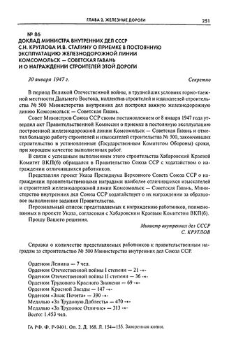 Доклад министра внутренних дел СССР С.Н. Круглова И.В. Сталину о приемке в постоянную эксплуатацию железнодорожной линии Комсомольск - Советская Гавань и о награждении строителей этой дороги. 30 января 1947 г.