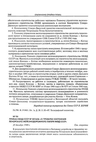Главная Серия «Россия. XX век. Документы» Сталинские стройки ГУЛАГа. 1930-1953 Приказ НКВД СССР № 001606 «О проверке состояния Печорского железнод...