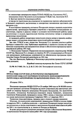 Приказ НКВД СССР № 0220 «О результатах обследования комиссией НКВД СССР состояния Печорского железнодорожного лагеря НКВД и мероприятиях по выполнению плана 1941 г.». 30 апреля 1941 г.