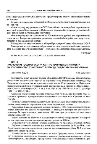 Заключение Госстроя СССР № 422сс по техническому проекту на строительство тоннельного перехода под Татарским проливом. 22 ноября 1952 г. // ГА РФ. Ф. Р-5446. Оп. 60. Д. 7891. Л. 2-10. Подлинник.