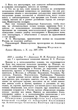 1812 г. октября 9 — Донесение М. И. Кутузова Александру I с приложением показании шпиона А. С. Платера // Сб. ист. матер., вып. X, стр. 68-70.