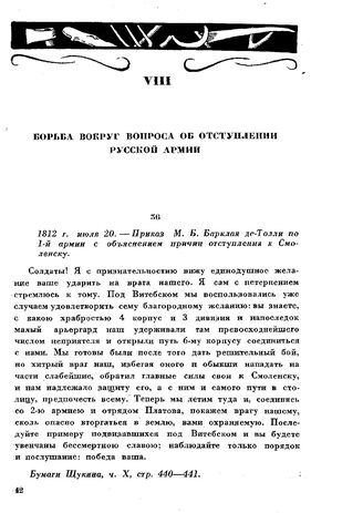 1812 г. июля 20. — Приказ М. Б. Барклая де Толли по 1—й армии с объяснением причин отступления к Смоленску // Бумаги Щукина, ч. X, стр. 440-441.