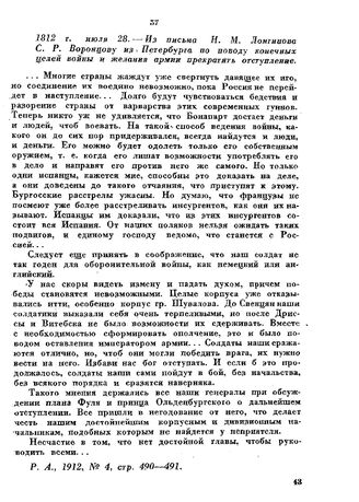1812 г. июля 28. — Из письма Н. М. Лонгинова С. Р. Воронцову из Петербурга по поводу конечных целей войны и желания армии прекратить отступление // Р. А., 1912, № 4, стр. 490-491.