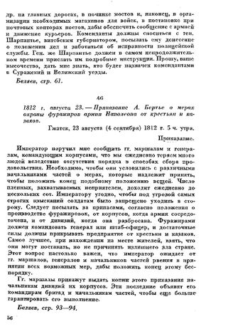 1812 г, августа 23. — Приказание А. Бертье о мерах охраны фуражиров армии Наполеона от крестьян и казаков // Беляев, стр. 93-94.