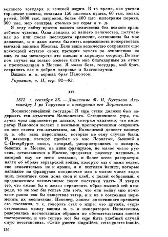 1812 г. сентября 23 — Донесение М. И. Кутузова Александру I до Тарутина о посещении его Лористоном // Материалы, т. XIX, стр. 379-380.