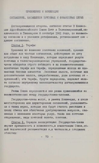 Приложение к конвенции. Соглашение, касающееся почтовой и финансовых служб. Тананариве, 8 сентября 1961 г. // Accords et Conventions е de l'Organisation Commune Africaine et Malgache. Septembre 1961 - Mai 1967. Le Secretariat Général de l'ОСАМ. Yaoundé.