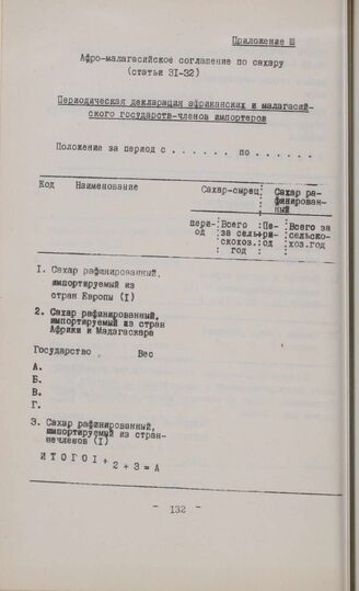 Приложение к Афро-малагасийскому соглашению по сахару III. Периодическая декларация африканских и малагасийского государств-членов импортеров // Nations Nouvelles, №№ 11-12, 1967.