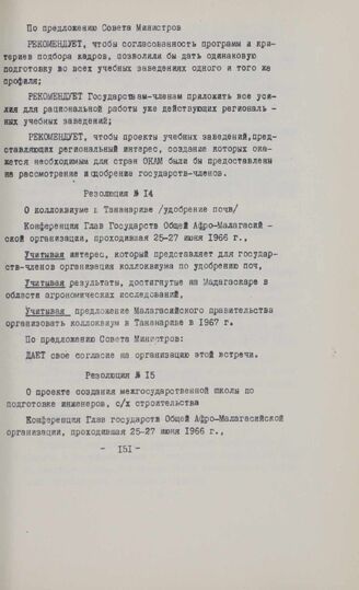 Резолюции конференции глав государств и правительств Общей афро-малагасийской организации. Тананариве, 25-27 июня 1966 г. Резолюция № 15. О проекте создания межгосударственной школы по подготовке инженеров, с/х строительства // Résolution de la Conférence des Chefs d'Etat et de Gouvernement de l'Organisation Commune Africaine et Malgache. Tananarive, 25-27 juin 1966. Edité par le Secrétariat Général de l'OCAM. B. P. 437 Yaounde.